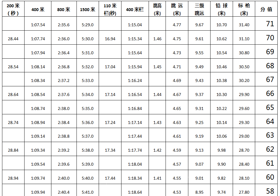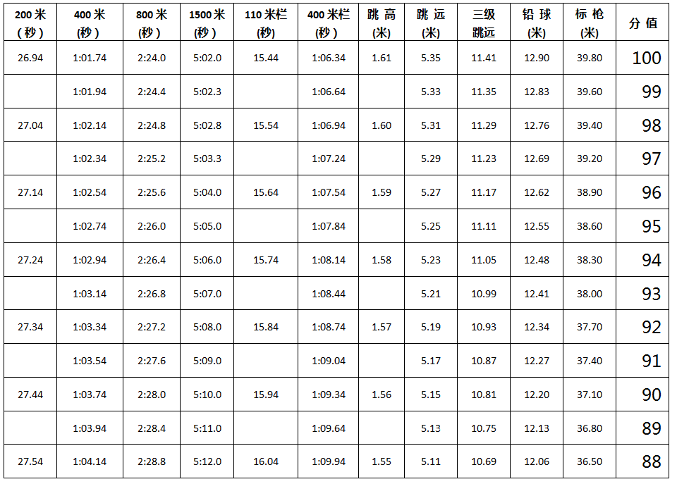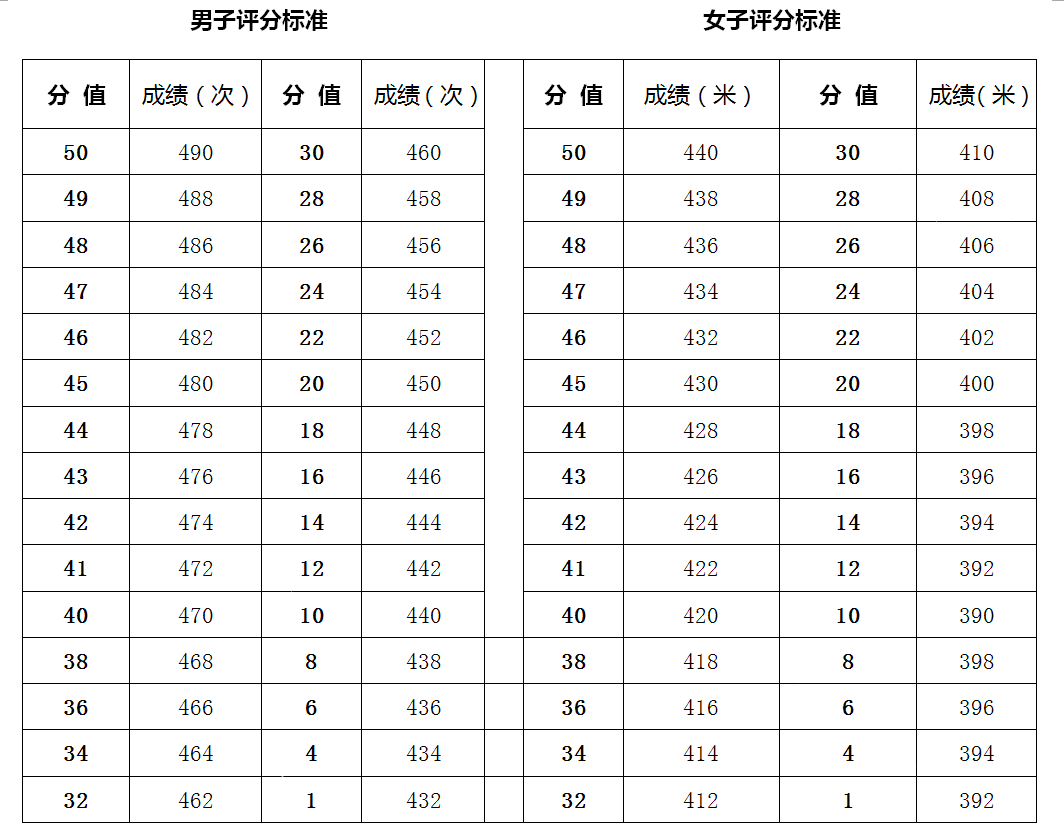 4. 测试采用人工手计时方法同时计取成绩进行评分。计成绩时,如计时成绩在评分标准的两个相邻分值之间,则取其中较低的分值评分。详见“身体素质考试100米跑评分标准表”。
