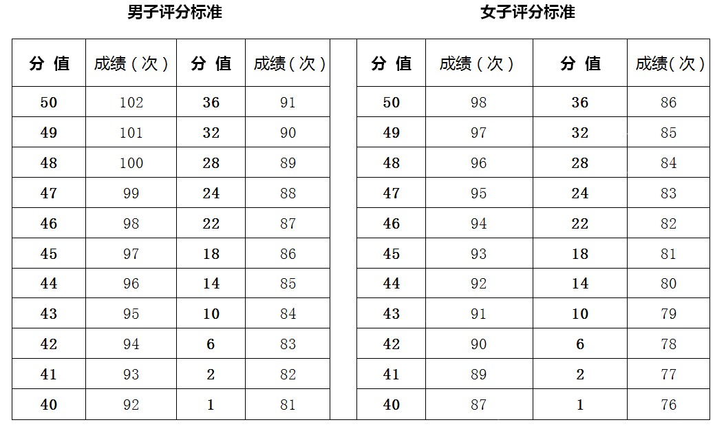 动作要求:连续屈体分腿跳:垂直起跳至屈体分腿位置(双腿夹角90度),手臂与躯干高于双腿伸展,躯干和双腿的夹角不大于60度,双腿必须平行或高于水平面,双腿并拢同时落地并脚站立,落地连续下一次起跳,中间过程没有第二次起跳准备动作;一般俯卧撑:采用双手略宽于肩,双脚并拢,挺胸收紧腰腹部,然后屈肘让重心下降至胸部快贴近地面1厘米的位置,稍停,再集中胸大肌的力量快速推起。(好——4~5分;一般——2~4分;差——1~2分)