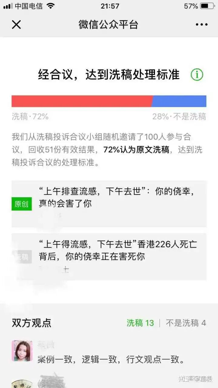 所以结果是,你写了一篇文章,别人体面的会申请转发,不体面的就直接洗稿了。洗稿是完全无法用现有任何技术去解决的,AI 可能可以辅助,但经常解决不了问题。看微信公众号出现洗稿纠纷,都还是靠网友评议来决策。