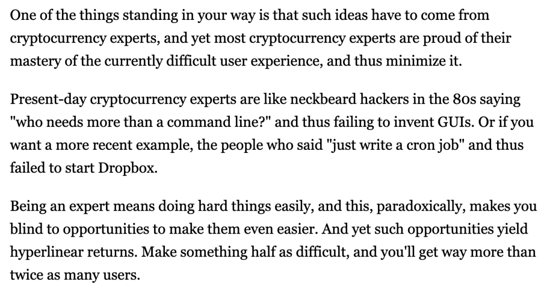 我们再退一万步说,Web3 的未来是理想的。那也可以看看目前 Web3 的骨感现实。在这方面,完全可以参考 Moxie Marlinspike 的这篇知名的文章:《My first impressions of web3》。