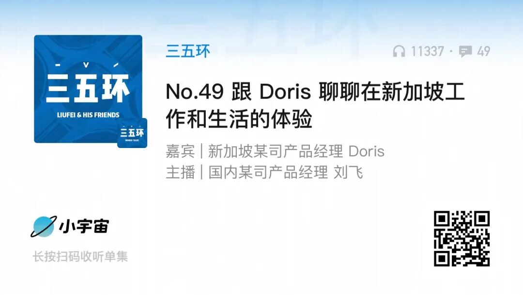 刘飞:对于对新加坡感兴趣的朋友,你会有什么建议吗?Doris:我很想鼓励那些想要工作和生活平衡的同伴来新加坡。很多国内的同学来了之后,他们就会说这里实在是太不卷了,实在是工作量太少了。但我有时候会觉得,如果你从另一个角度来看,是不是其实大家在国内的时候少了考量很多生活的因素,是不是真的花了太长的时间在工作呢?也许很多业内的朋友一起努力,可能有一天在国内大家也就可以摆脱这种状况,也就可以拥有更多的自由度和价值观的多元性,不需要大家都一定要秉承一种“所有人一定要努力往前冲”、“每一个人都要007”、“每一个人都要996”的氛围。愿意996当然没有问题,但是给一些不愿意的人留有空间,我觉得这是很棒的一件事情。但如果你只是把新加坡当成是一个逃避的出口,未必你会过得很高兴,毕竟很多人到新加坡来的时候,一上来没有朋友,所有的社会关系打碎重建,这不是一个特别容易的事情,所以要慎重。你要来问我新加坡这个话题的时候,我一开始都非常地犹豫,因为我觉得很多人可能有两个想法:一是说我们看不到国内的明显增量在哪里,而东南亚好像还在早期,你能够 foresee 之后会是什么样子,你处在一个时间机器的另一端,可以回来说我看得到趋势即将如此,因此现在进来;但另一个方面是这里的工作环境、用户习惯、社会背景,跟旁边这么多国家,不同的市场、用户都是不一样的,这并不是完全说拿国内的优势,就可以直接复制过来铲平一切,还是要对当地和在地的有尊重跟敬畏,还是要真的看到这些市场的用户,都是活生生的人。当要进入一个尤其新的市场,或者说要在一个新的环境里去做事情的时候,我们有多大程度可以抛开自己的成见,抛开自己对于原有所在的社会环境的角度,去看一个新的地方,我觉得这是很重要的一件事情。某种程度上你在一个新环境里能不能过得开心,跟你有没有那么确定世界应该是如何的这件事是很相关的,或者说经常旅行的朋友,TA感受到的东西多数是会从一个当地人的视角,TA会努力说我来体验一下当地人是怎么生活的,对于一件事当地人是怎样想的,会有一种好奇心,会跟着当地的人的脚步,设身处地地去感受,这样TA的感受会比较舒服。