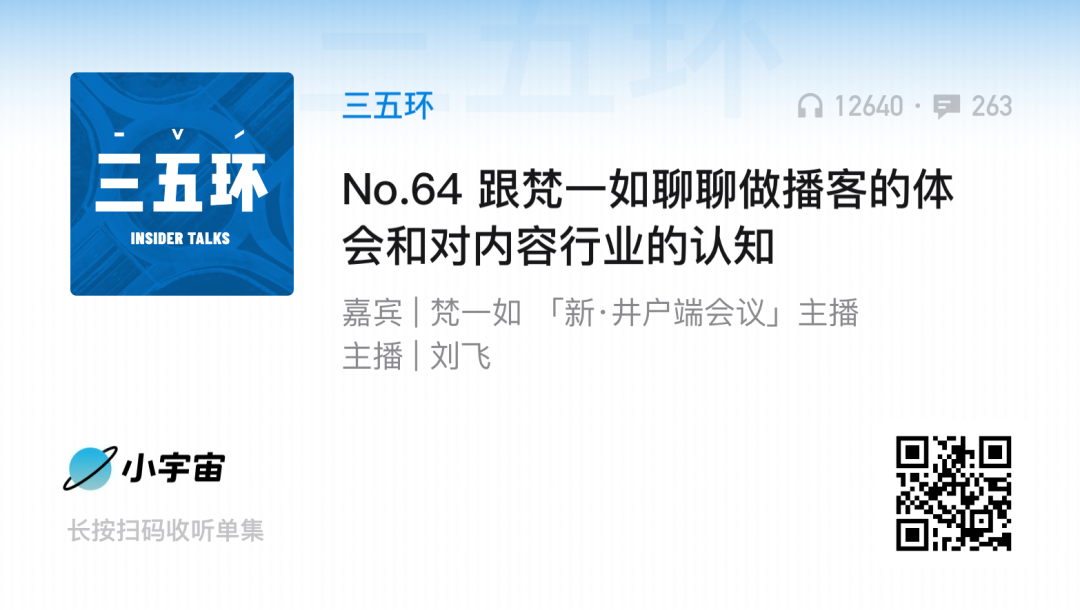 梵一如:我们经常看后台数据,《井户端会议》是65%左右的完播率,《东亚观察局》更高,几乎到70%以上。我经常说一个例子,比如《东亚观察局》现在每期的点击最终是2万,然后70%的完播率,相当于有2万人每周会听我们的节目几乎40分钟,这什么概念?抖音是15秒,播客是听几个人或者一个人讲话,讲40分钟,每周听,这对一个人心智的占领该如何定价呢?