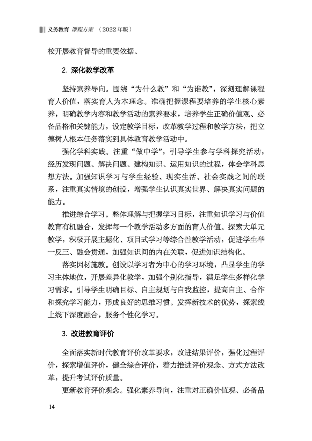 各门课程基于培养目标,将党的教育方针具体化细化为学生核心素养发展要求,明确本课程应着力培养的正确价值观、必备品格和关键能力。进一步优化了课程设置,九年一体化设计,注重幼小衔接、小学初中衔接,独立设置劳动课程。与时俱进,更新课程内容,改进课程内容组织与呈现形式,注重学科内知识关联、学科间关联。结合课程内容,依据核心素养发展水平,提出学业质量标准,引导和帮助教师把握教学深度与广度。通过增加学业要求、教学提示、评价案例等,增强了指导性。