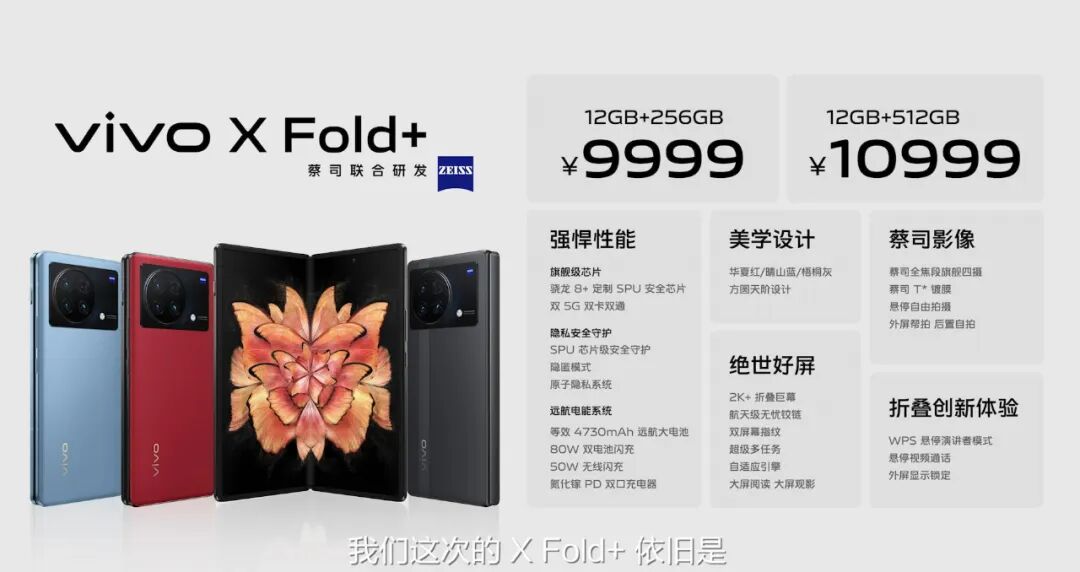 当然,这一切也少不了这套蔡司影像系统的加持。vivo X Fold+采用了后置四摄影像系统,四颗镜头分别为4800万像素超广角主摄、5000万像素OIS超大底主摄、1200万像素的人像镜头以及支持五倍光学变焦的潜望式镜头,同时诸如强大的蔡司T*镀膜、蔡司镜头包等等,全部集成在这台vivo X Fold+中。