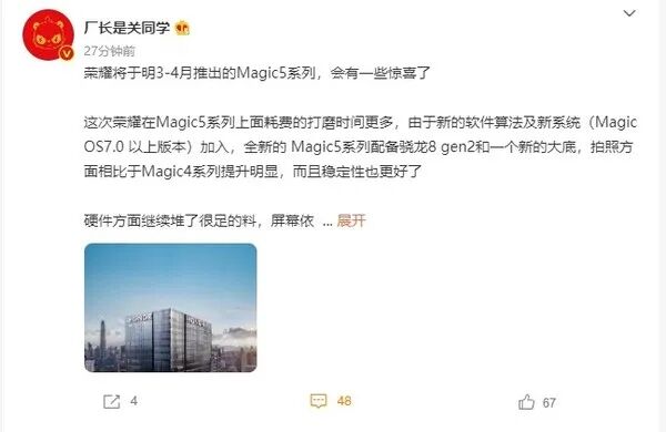 此前有爆料称,荣耀Magic5系列将在今年年底发布,实际上可能不会,有数码博主发微博表示,荣耀Magic5系列今年不会发,荣耀Magic系列已经确定将“一年一更”,Magic5系列会保持Magic4系列的同步节奏。对于这款还未发布的新机,不少的消费者都在关注着。从多位博主爆料的信息来看,荣耀Magic5系列会有不少提升的地方。9月27日,手机中国注意到,有数码博主发微博称,荣耀将于明年3-4月推出的Magic5系列,会有一些惊喜。