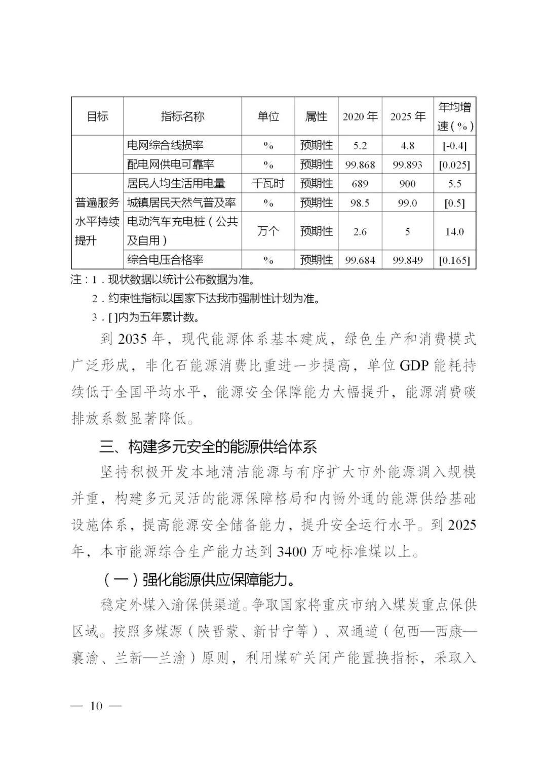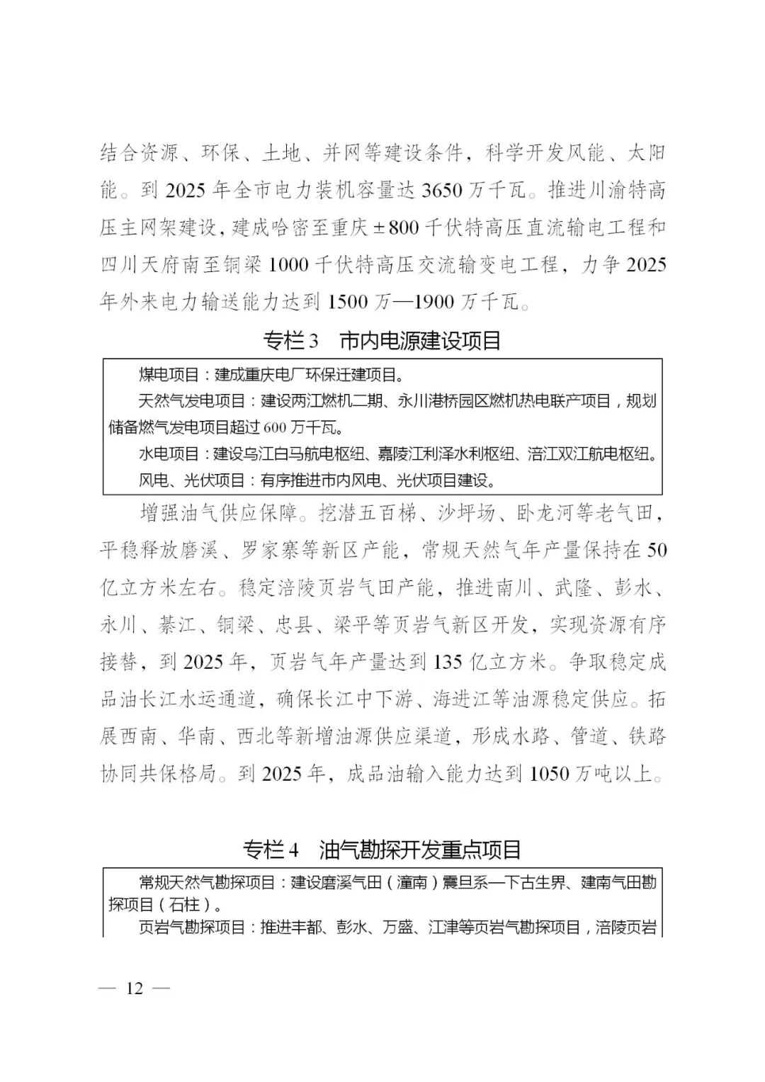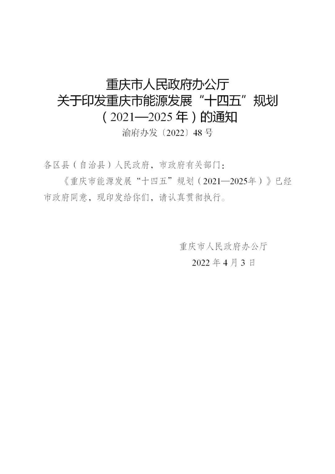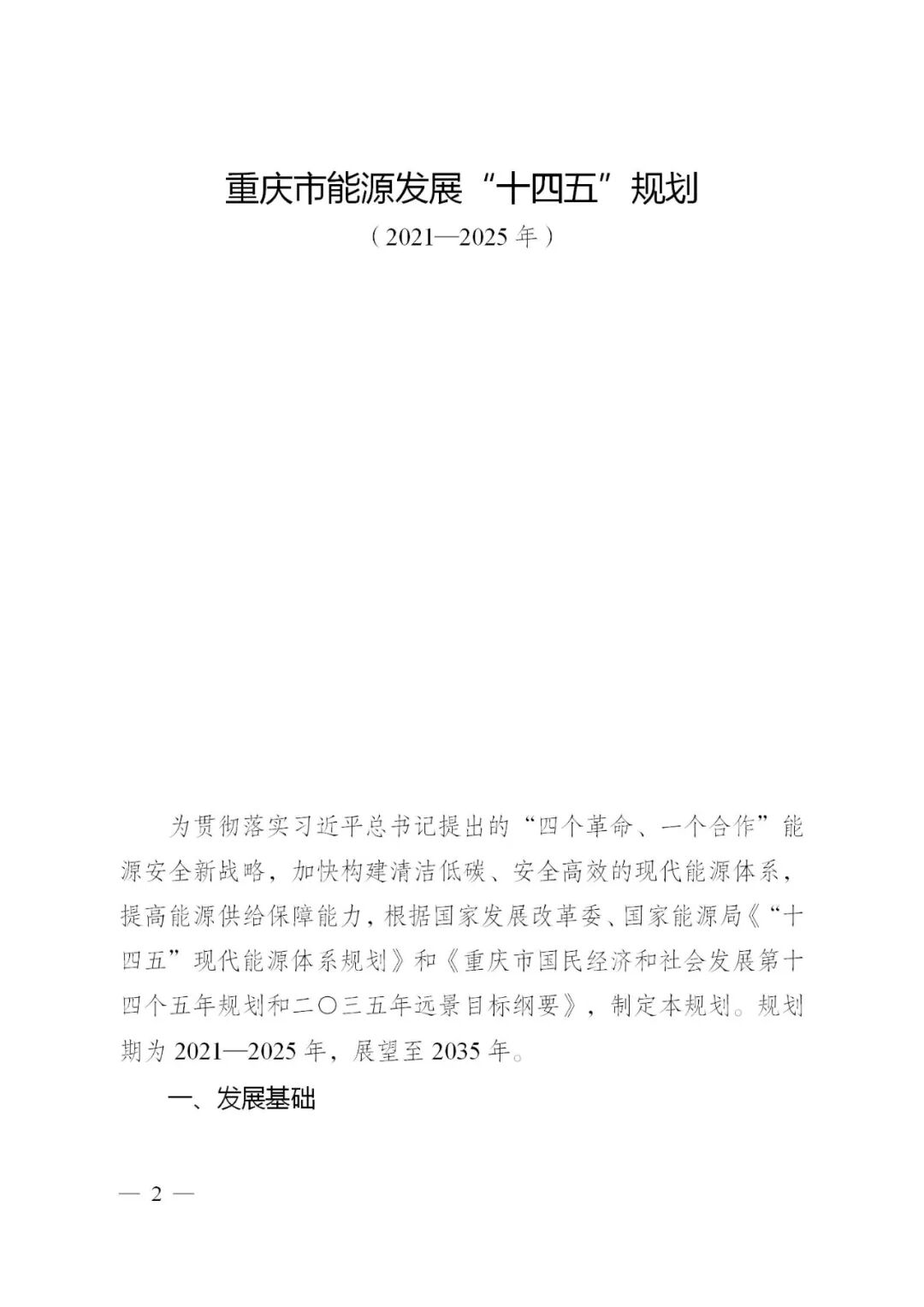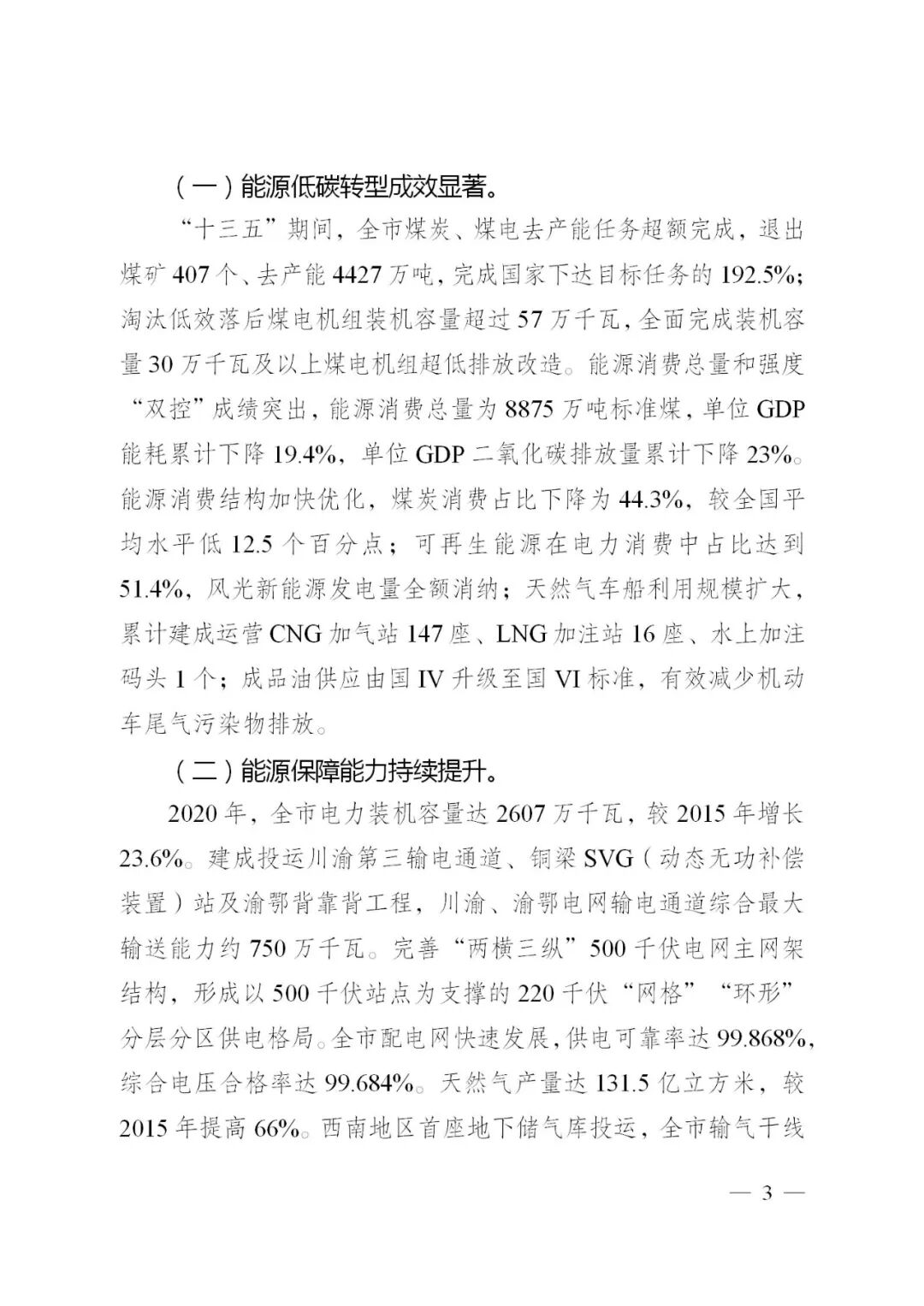 6月15日,《重庆市能源发展“十四五”规划》印发,规划对“十四五”能源发展做出规划。文件提出:“能源保障安全有力。到2025年,煤炭供应保障能力达到5000万吨;电力装机容量达到3650万千瓦,全社会用电量达到1620亿千瓦时;常规天然气、页岩气产量分别达到50亿立方米、135亿立方米;成品油供应能力达到1050万吨;能源储备体系进一步完善,应急保供能力进一步增强。”