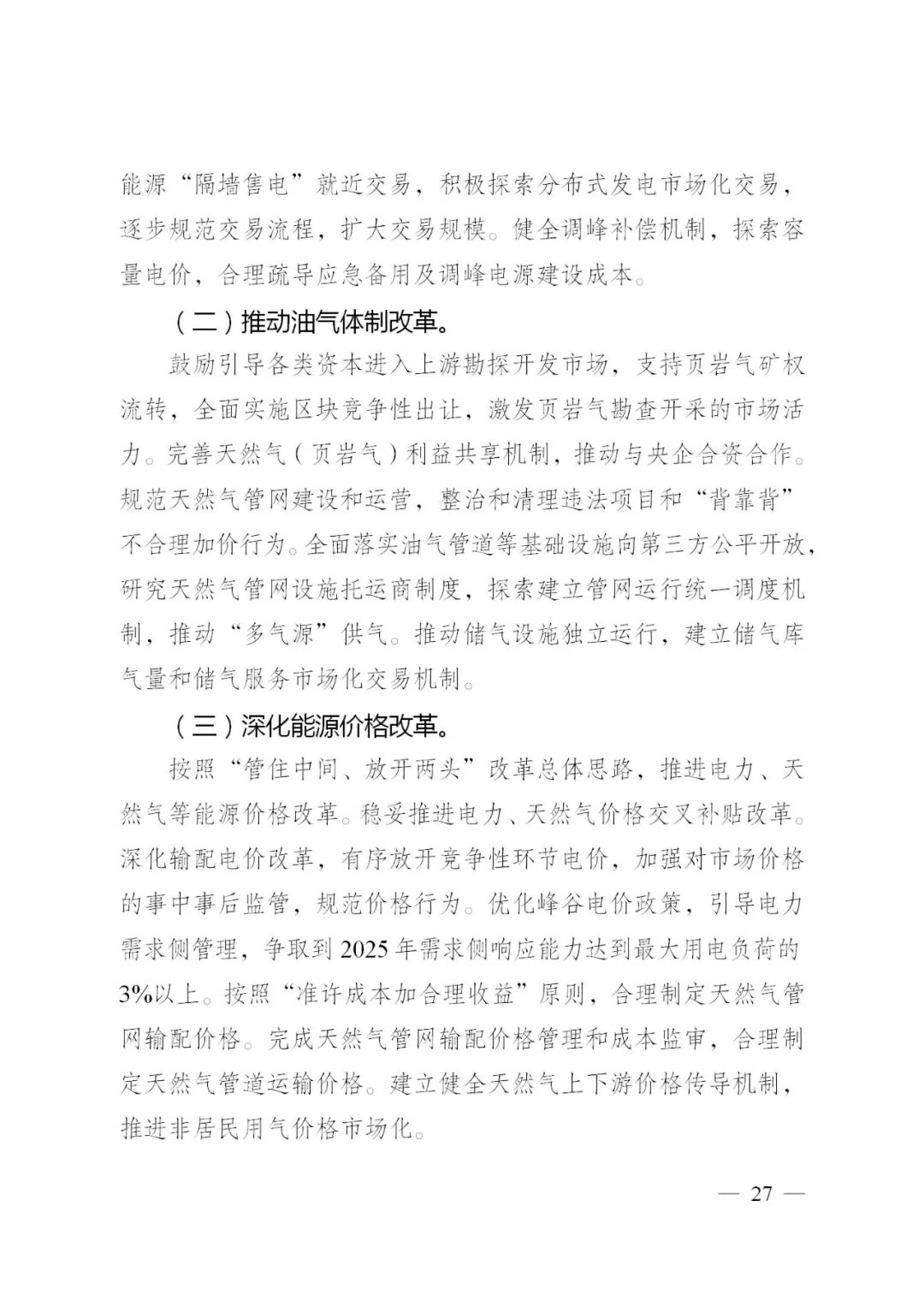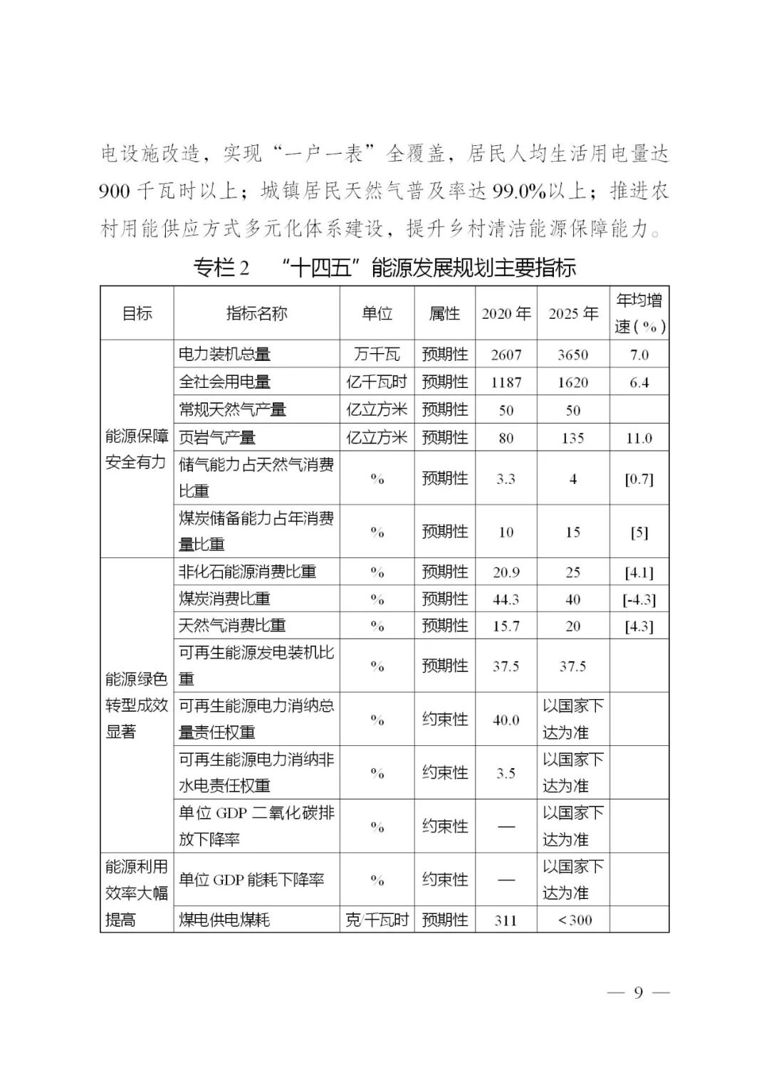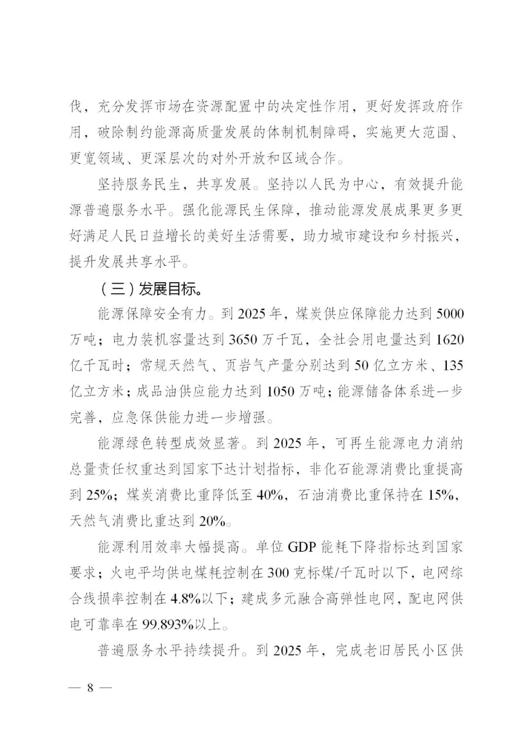 “能源绿色转型成效显著。到2025年,可再生能源电力消纳总量责任权重达到国家下达计划指标,非化石能源消费比重提高到25%;煤炭消费比重降低至40%,石油消费比重保持在15%,天然气消费比重达到20%。”
