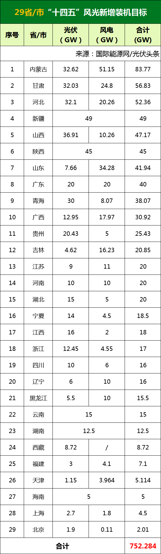 据国际能源网/光伏头条(pv-2005)不完全统计,截止目前,共有北京、福建、甘肃、广东、广西、贵州、海南、河北、河南、黑龙江、湖北、湖南、吉林、江苏、江西、辽宁、内蒙古、宁夏、青海、山东、山西、陕西、上海、四川、天津、西藏、新疆、云南、浙江等29省/市发布“十四五”期间风、光装机规划目标,新增752.284GW。