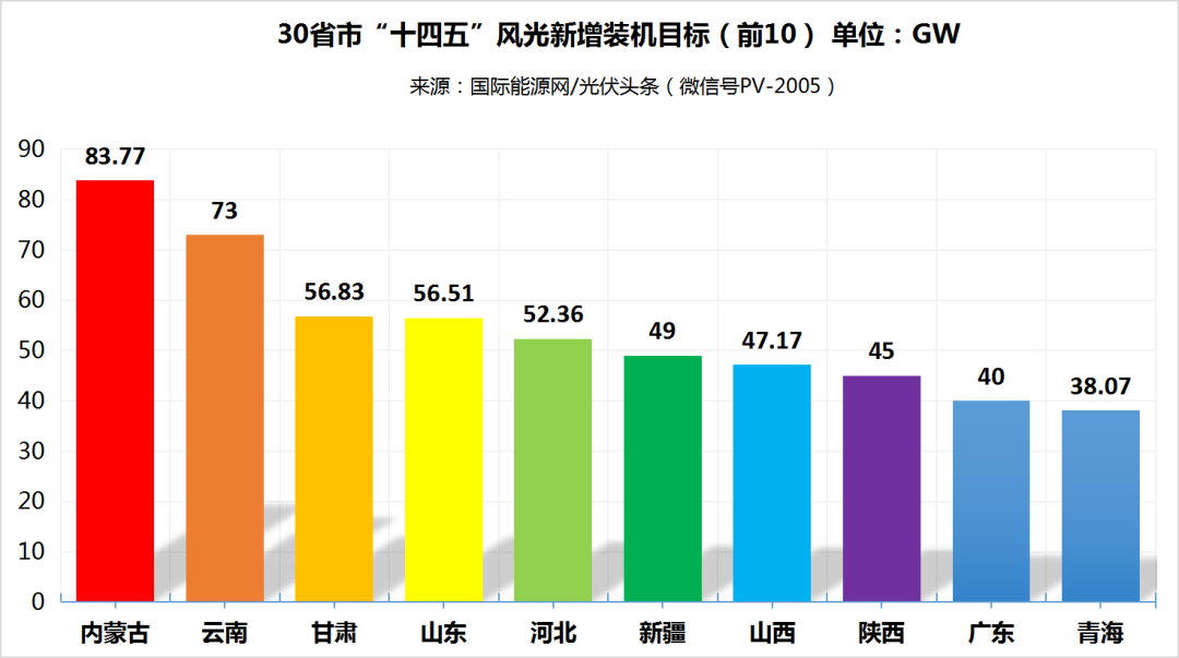 据国际能源网/光伏头条(PV-2005)不完全统计,截止目前,共有安徽、北京、福建、甘肃、广东、广西、贵州、海南、河北、河南、黑龙江、湖北、湖南、吉林、江苏、江西、辽宁、内蒙古、宁夏、青海、山东、山西、陕西、上海、四川、天津、西藏、新疆、云南、浙江30省/市发布“十四五”期间风、光装机规划目标,新增874.037GW。其中,从各省规划新增装机目标来看,内蒙古、云南、甘肃体量最大,其中内蒙古计划新增83.77GW,云南计划新增73GW,甘肃计划新增56.83GW。另外,9省新增目标在30GW以上,分别是山东、河北、新疆、山西、陕西、广东、青海、广西、江苏。除此之外,“十四五”期间,新能源+储能成为各省关注的重点之一,14省新型储能装机目标累计达到47.8GW,分别为甘肃、青海、山西、内蒙古、山东、河北、浙江、河南、湖北、广西、天津、安徽、江苏、辽宁。其中,甘肃、青海、山西3省较为突出,新型储能装机目标均达到6GW,内蒙古新型储能装机目标达到5GW,山东新型储能装机目标达到4.5GW。抽水蓄能装机目标也有提及,8省“十四五”抽水蓄能装机目标累计达到49.34GW,分别为湖南、浙江、福建、安徽、山东、江苏、辽宁、陕西。其中,湖南抽水蓄能装机目标达到20GW(注:到2030年达到20GW),规模排名第一。浙江抽水蓄能装机目标达到7.98GW,排名第二。福建抽水蓄能装机目标达到5GW,位列第三。