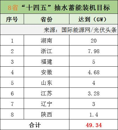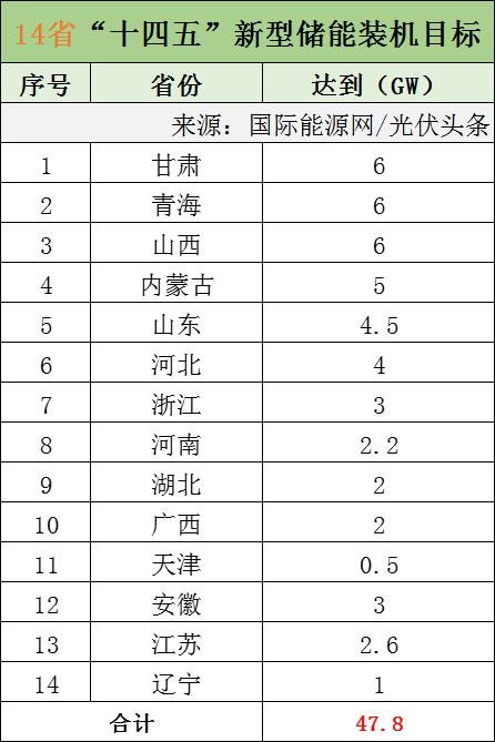 安徽、北京、福建、甘肃、广东、广西、贵州、海南、河北、河南、黑龙江、湖北、湖南、吉林、江苏、江西、辽宁、内蒙古、宁夏、青海、山东、山西、陕西、上海、四川、天津、西藏、新疆、云南、浙江30省/市规划了“十四五”期间风、光新增装机目标。详情如下:2021年4月21日,国家发展改革委和国家能源局公布了《关于加快推动新型储能发展的指导意见》,明确到2025年新型储能装机规模达3000万千瓦以上。据统计截至2020年底,中国已投运电化学储能累计装机为3269.2兆瓦,即330万千瓦,按照文件提出的装机目标,到2025年中国的电化学储能安装量将增加10倍左右。据国际能源网/光伏头条(PV-2005)不完全统计,截止目前,甘肃、青海、山西、内蒙古、山东、河北、浙江、河南、湖北、广西、天津、安徽、江苏、辽宁14省发布“十四五”期间新型储能装机目标达到47.8GW。详情如下:2021年9月,国家能源局发布的《抽水蓄能中长期发展规划(2021-2035年)》明确,到2025年,抽水蓄能投产总规模6200万千瓦以上;到2030年,投产总规模 1.2 亿千瓦左右。据国际能源网/光伏头条(PV-2005)不完全统计,截止目前,湖南、浙江、福建、安徽、山东、江苏、辽宁、陕西8省发布“十四五”期间抽水蓄能装机目标达到47.8GW。值得注意的是,湖南发文,纳入国家抽水蓄能中长期规划“十四五”重点实施的13个抽水蓄能电站今年内全部核准启动建设,到2030年全省抽水蓄能装机达到2000万千瓦。更有“十四五”期间风光储装机目标相关政策规划资料包!扫面下方二维码获取!