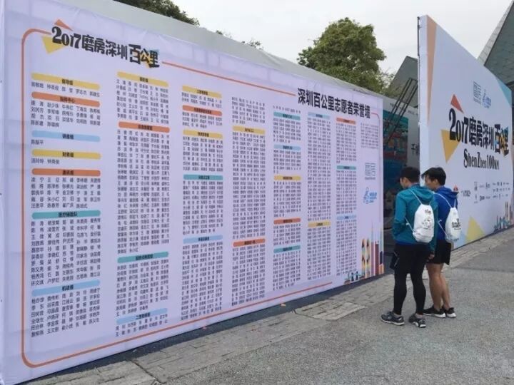 很多人都会说你们组织百公里,上万人参加,一定会花很多的时间、很多的精力、很多的人去组织。这是2017年百公里的起点,我们做了一个深圳百公里志愿者荣誉墙。我们把2017年的百公里的志愿者的名字打在墙上面,差不多有2000人。