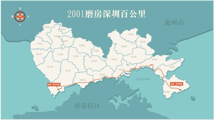 于是在磨房发了一个帖子,说我们尝试一下,试试用双脚丈量深圳,在深圳24个小时不间断地去完成一百公里徒步,从蛇口的海上世界走到大鹏的东涌沙滩。他当时这样一个很不经意的倡议,没有想到后面十几年会一直延续下来。这个是2001年的磨房深圳百公里,就是第一届百公里的线路。
