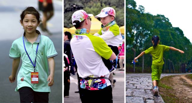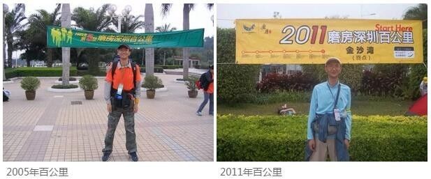 这个可能是我们看到的最小的百公里的参加者,2011年她大概2岁多一点,她爸爸背着她参加了百公里,这位父亲也是2008年百公里的总协调人。2012年她又参加了,小朋友长得还是蛮快的,这个脚就长出来了。