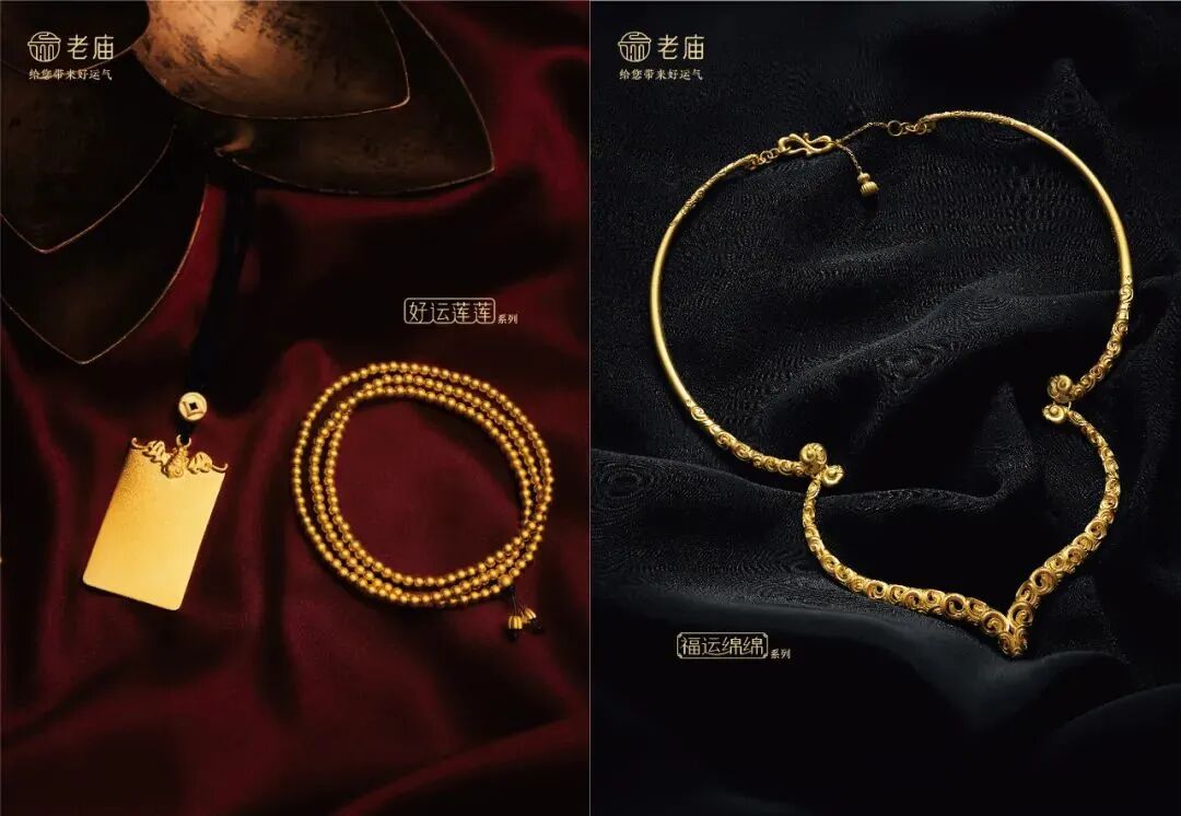 老庙推出的古法金相关产品,则十分强调时尚感。2022年,老庙引入国际珠宝、时装设计师合作开发了全新婚嫁系列“老庙有鹊系列”,以及老庙古韵·事事金安套系,都是其在寻求差异化的过程中,摸索出的一系列时尚感较强的的古法金产品。