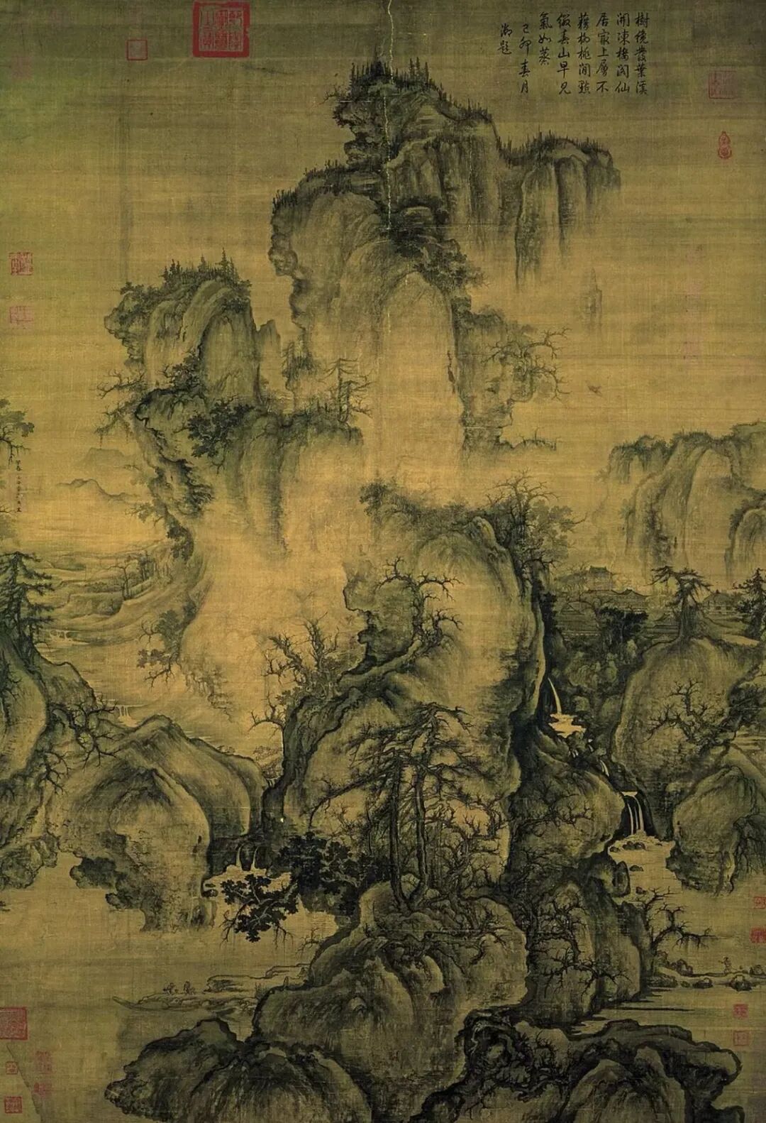 《早春图》是北宋画家郭熙的代表作,以全景式高远、平远、深远相结合之构图,表现初春时北方高山大壑的雄伟气势。画作右上有乾隆皇帝御题诗:“树才发叶溪开冻,楼阁仙居最上层,不藉柳桃闲点缀,春山早见气如蒸。”