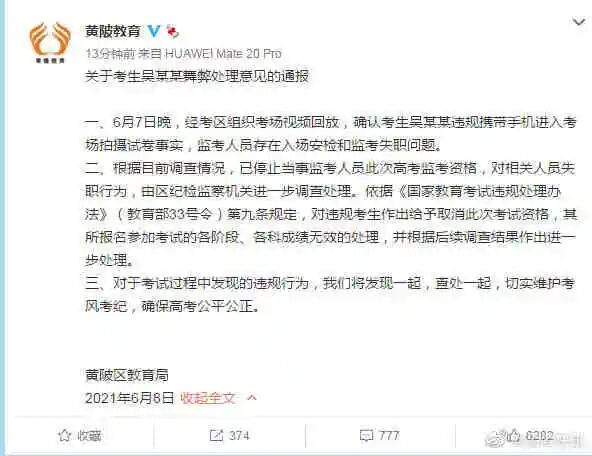起因就是“小猿搜题”APP的工作人员监测后台时发现,某用户通过手机拍照搜索疑似高考真题,便向有关部门举报。经核实确认考生吴某某违规携带手机进入考场拍摄真题。