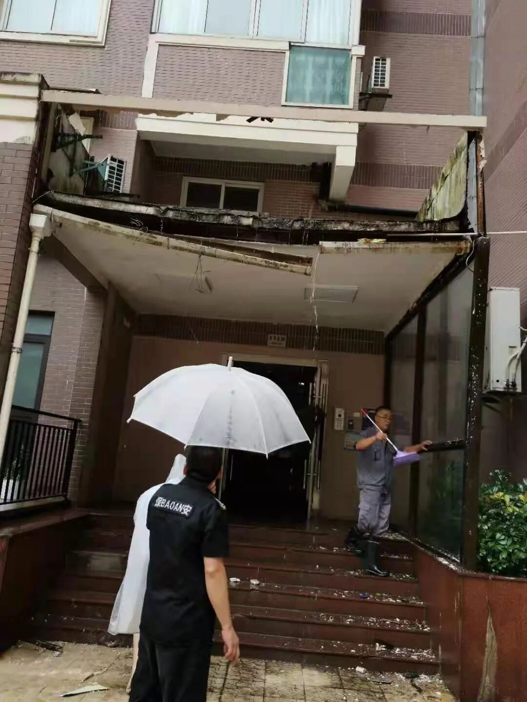 网友反映说:古北一期里昂花园内,某号楼的门头掉了下来!