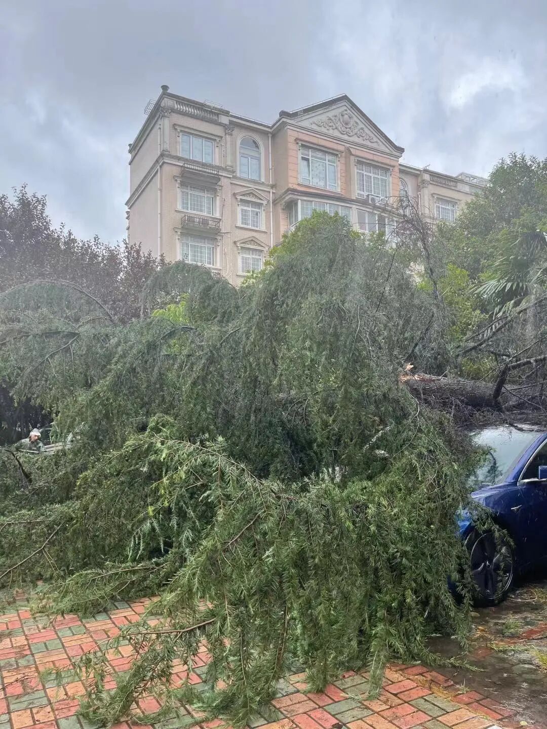 网友@宇宙無敵大吃貨 说:闵行区水清路999弄香树丽舍小区内发生大树压坏2辆轿车的事故,早上出门的时候树还压着,一辆雪弗莱估计报废了,特斯拉是玻璃碎了。物业工作人员基本处理了外面的情况,其余的等绿化公司的过来处理,20多年的松树,物业处理不了。