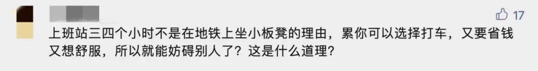 “上班站三四个小时不是在地铁上坐小板凳的理由,累你可以选择打车,又要省钱又想舒服,所以就能妨碍别人了?这是什么道理?”