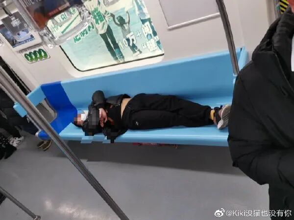而这几位朋友,你们是不是“坐”得太舒服了一些?或许我们该给上海地铁建议一下,给你们准备几张卧铺?