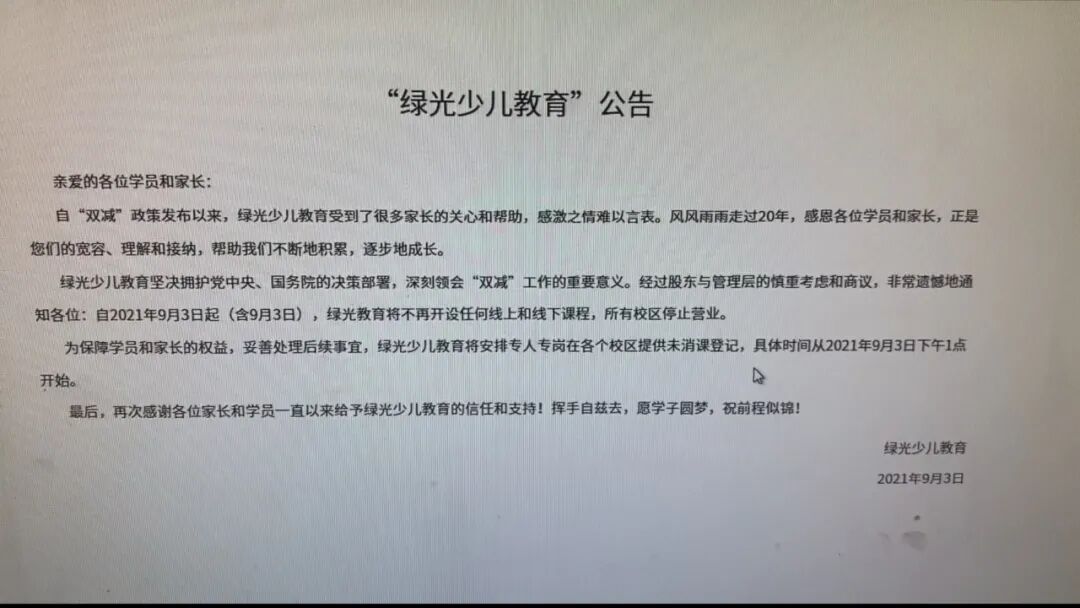 上海老牌培训机构绿光少儿教育在上海经营20年,在全上海有30多个校区,在家长中口碑一直不错,9月3日,该机构却突然发布停业公告,所有校区停止营业。