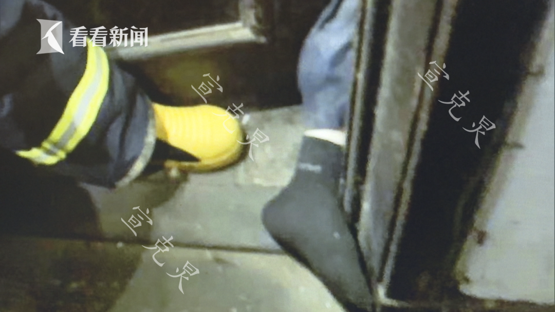 现场视频显示:郑老伯的腿被紧紧夹住,消防队员利用救援工具将门的下半部分锯开,成功将其救出。![]()
