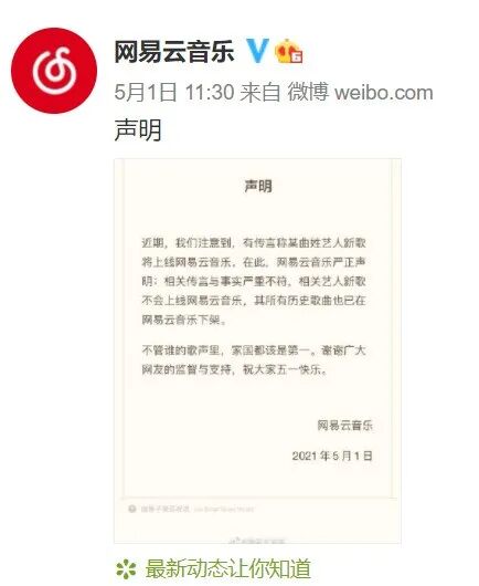 不过,5月1日中午,@网易云音乐 就发布正式声明,再次澄清“曲婉婷在该平台公开新歌”的相关传言与事实严重不符,明确表示不会上线曲姓艺人的新歌,并称其所有历史歌曲也已在平台下架,“不论谁的歌声里,家国都该是第一。”