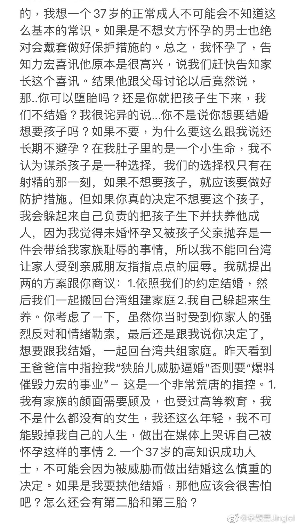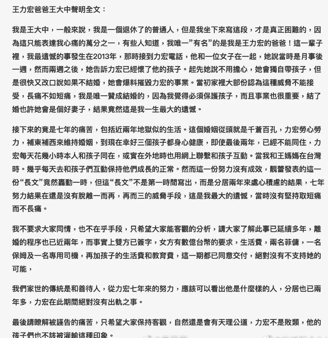 而王力宏父亲发完声明,李靓蕾迅即发布微博称:王力宏不会告诉父亲自己出轨、招妓的事情。@李靓蕾Jinglei 看到王爸爸年纪这么大了还要为了45岁的儿子出来说这样谎,拍这样的照片觉得很心痛也很不敢置信。我们都是成年人了,出了事情应该自己面对,自己做的事情由自己来负责承担。我原本是不想要提及太多,很遗憾需要公开谈论这么不堪回首的往事。