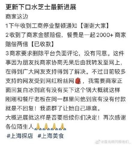 据其他媒体报道,大众点评上的页面信息显示,该餐厅已经“暂停营业”。然而,记者今天打开大众点评搜索该店家时,发现尽管商家的道歉声明依然存在,可是“暂停营业”标签已经悄咪咪地消失了……商家表示:涉事的芝士轮已于当天晚上销毁。30日该店已关门严肃整顿餐厅内部的食品卫生相关的管理工作。商家向广大消费者承诺一定严格按照国家规定遵守食品卫生管理标准。![]()