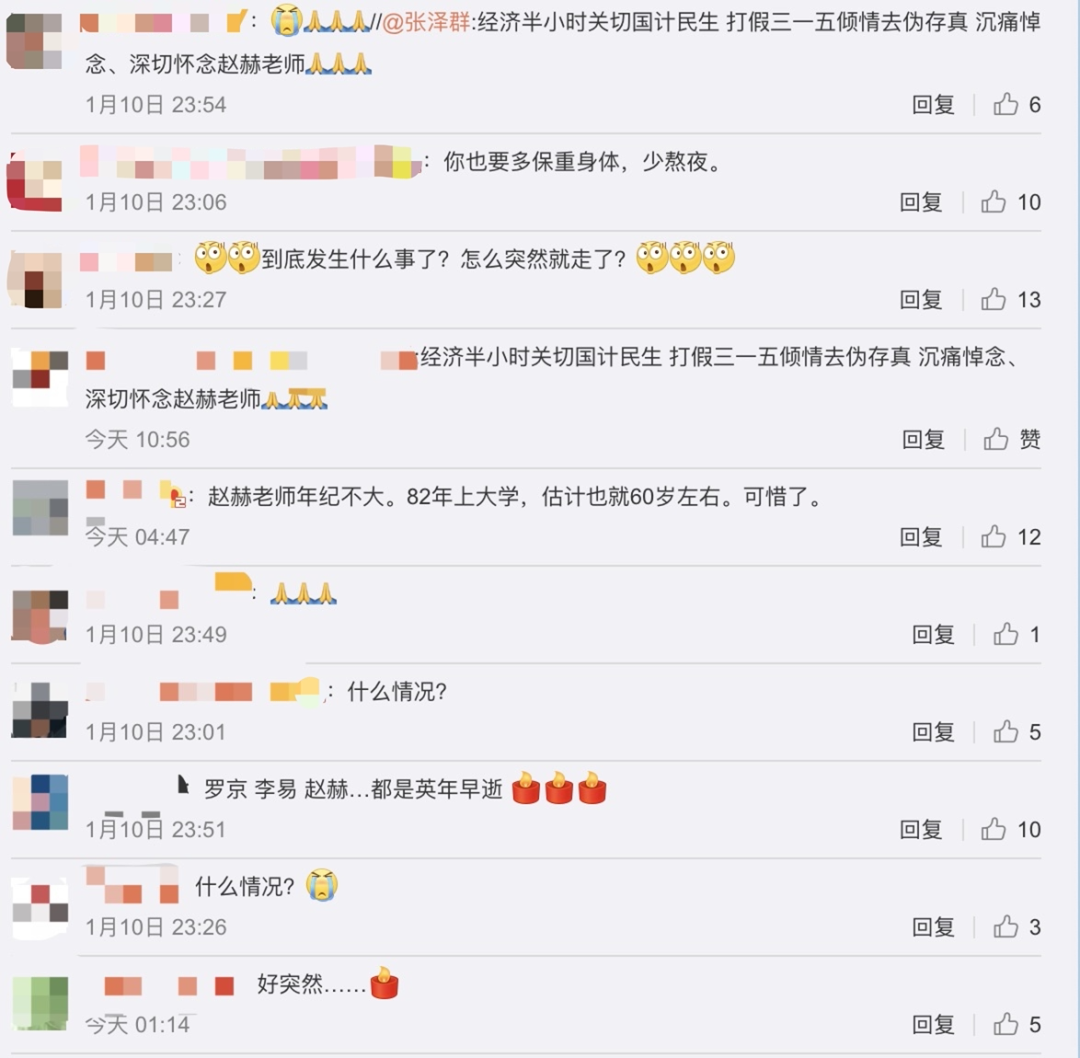 1月10日晚,据著名主持人@张泽群 消息:“经济半小时关切国计民生,打假三一五倾情去伪存真,沉痛悼念、深切怀念赵赫老师”。