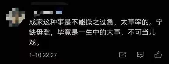 就在前两天,#22岁女子回村一天被安排20场相亲#的话题登上了热搜榜。流传在网络视频中的被相亲女子称:“与自己同龄的都结婚生小孩了,因此家里人比较着急,所以在一天时间内差不多有20个相亲对象。该女子表示,家里那边相亲都是这种情况,村里这个年龄段的女孩子比较少,所以在人生大事上要相看好了才能决定。”对此,一些网友表示,不理解这种行为,并称“真的很离谱”,“才22岁,为什么大人一定要着急把女儿嫁出去”,“找工作面试都没有这么赶的”……与此同时,还有一部分网友表示,“自己的年龄已经远远大于22岁,但是没有必要操之过急”,“成家是人生中的大事情需要谨慎,宁缺毋滥”,“先好好成长,多多探索美好的世界,再来考虑婚姻也不迟”……