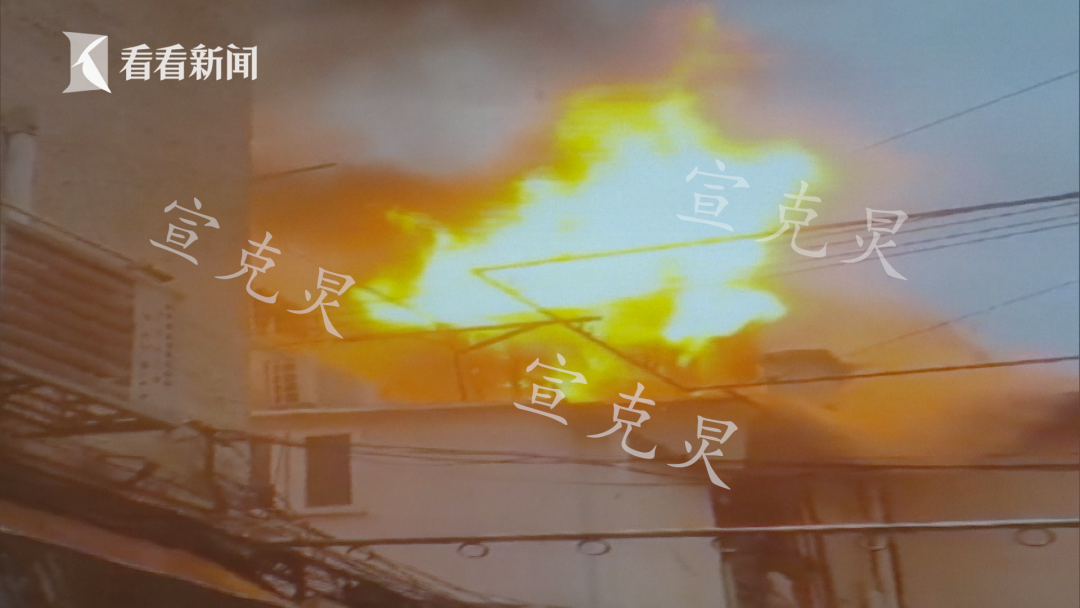 视频显示:正对里弄主干通道的二层阁楼燃起熊熊明火,浓烟四起弥散空中。消防人员已经赶到现场,6辆消防车停在路边,警灯闪烁。