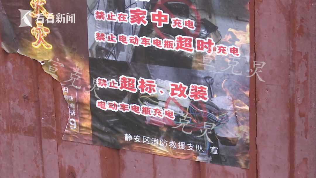记者看到,起火阁楼的窗户、屋檐都沾满了救火用的泡沫水,钢筋、铁架被熏得漆黑。起火居民楼一楼的大门上还张贴着宣传“电瓶车电瓶消防安全隐患”的告示。