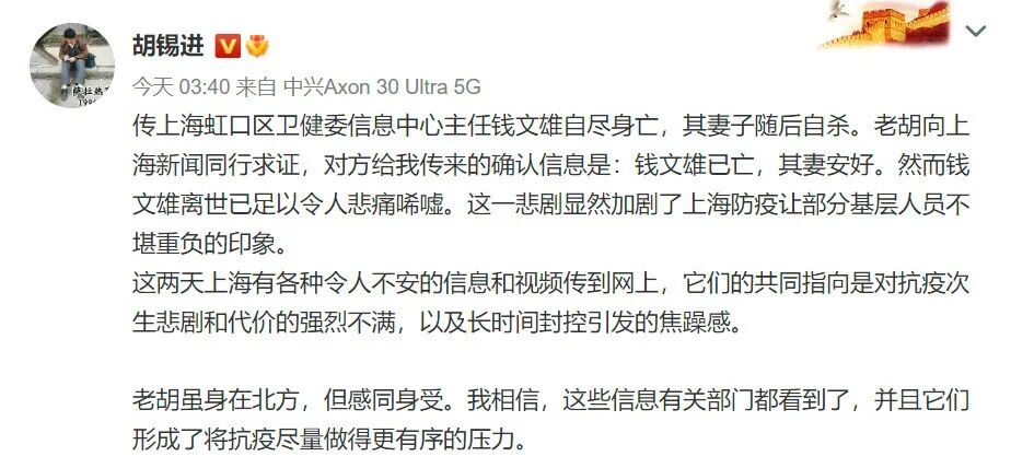 针对网传“原上海北蔡镇党委书记”、“虹口区卫健委信息中心主任钱文雄夫人”自杀传闻,上海警方于2022年4月14日凌晨作出回应:经警方核实,两则网传信息均为谣言,公安机关严厉谴责此类恶意造谣传谣行为,将坚决依法追究其法律责任。传上海虹口区卫健委信息中心主任钱文雄自尽身亡,其妻子随后自杀。老胡向上海新闻同行求证,对方给我传来的确认信息是:钱文雄已亡,其妻安好。然而钱文雄离世已足以令人悲痛唏嘘。