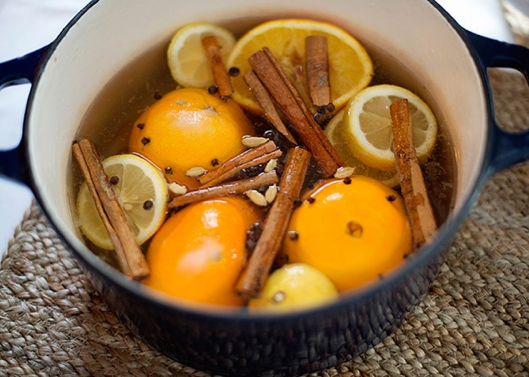 3.加入柠檬、甜胡椒籽、肉桂碎末和橘子。