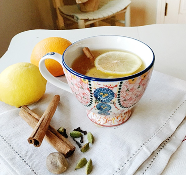 5.将酒倒入杯中,加一片柠檬片,磨碎一些肉豆蔻,再加入一根肉桂棒。