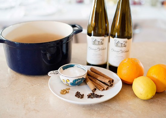 -2瓶雷司令 (优先选择澳洲雷司令) -1个橙子 -3朵丁香 -30克白糖 -半个柠檬 -3根肉桂棒 (制作前捣碎) | -100ml橙汁 -14个甜胡椒籽 -2个小豆蔻荚 (制作前压捣碎) -少量肉豆蔻 -切成薄片的柠檬 -适量完整的肉桂棒 (喝酒时食用) |