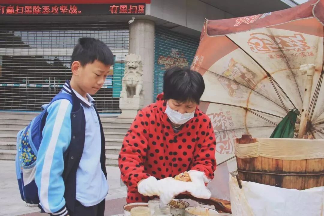 三轮车上只有糯米饭、榨菜、油条、白糖芝麻、辣椒酱、里脊肉以及自己制作的时令小菜,没什么花头但却是附近街坊戒不了的美味。