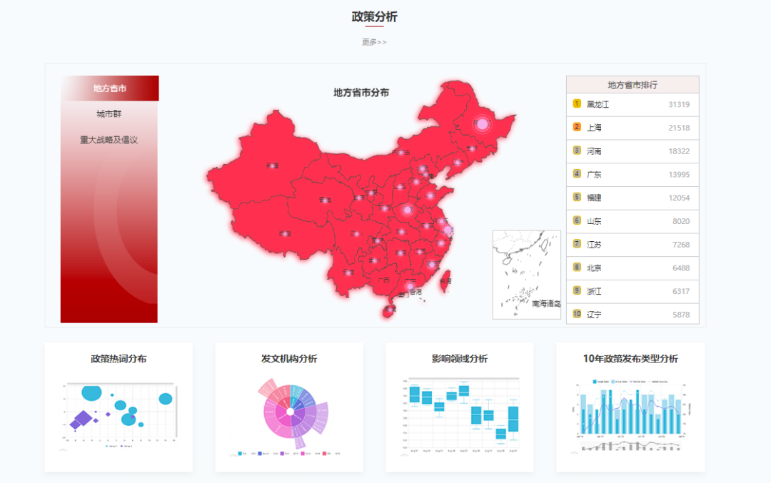 基于当前国家建设重点、热点内容打造政策专题,支持对检索内容进行关联性分析和可视化分析,构建政策地图。