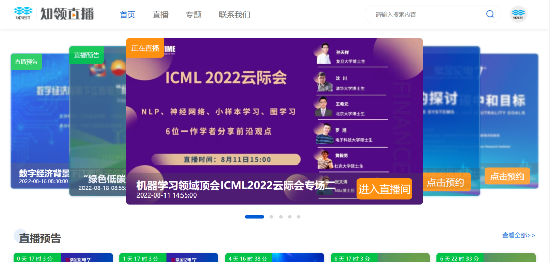 用户可在首页浏览直播预告、点击预约,对正在进行的直播用户可进入直播间进行观看,不限在线观看人数。