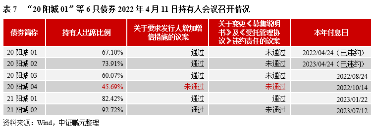 受企业偿债风险显露影响,不包含保护性条款的债券触发持有人会议召开条件。例如,2022年4月11日,“20阳城01”、“20阳城02”、“20阳城03”、“20阳城04”、“21阳城01”、“21阳城01”、“21阳城02”由债券受托管理人作为会议召集人召开持有人会议,审议的议案中包括增加增信措施,变更《募集说明书》及《受托管理协议》违约责任等。截至表决日中,仅“21阳城01”通过变更违约责任的议案,为此,其他债券均触发约定的违约情形,其中,“20阳城04”因未达出席比例,根据约定该次持有人会议无效。