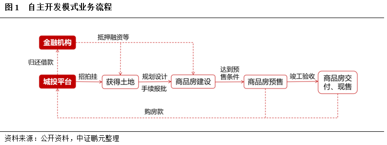 自主开发模式指城投公司对房地产项目完全自主经营,并以市场价出售。其运营模式与专业的房地产公司基本一致,即通过招拍挂获得土地,而后经过规划设计、施工建设、开盘预售、竣工交付等一系列流程,完成投资的闭环及资金的自平衡。