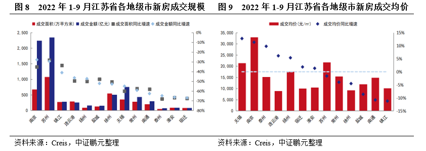 江苏省房地产交易市场表现显著弱于全国平均水平,但开发投资减速幅度不大,恐加大去化压力。从销售额、投资额等关键指标来看,江苏省的房地产业长期居于全国前两名,但在全国地产行情骤降的背景下仍难逃颓势。2022年1-8月,江苏省商品房交易面积及金额下跌幅度均远超全国平均水平,新开工面积也出现大幅下滑,但房地产投资额同比仅减少7.1%,跌幅在全国各省市中居于中等水平,后市供给量仍较为庞大,若销售端未见实质回暖,恐增加库存去化压力。单价方面,2022年1-8月,江苏省商品房销售单价相比2021年下降2.11%至1.26万元/平方米,略好于全国同期降幅3.64%,或与省内多地政府为维稳楼市相继发布“限跌令”有关。
