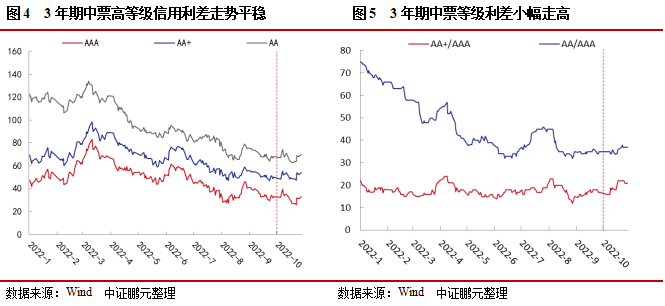 3年期中票信用利差走势平稳,等级利差小幅走高。10月,3年期中票 AAA、AA+、AA信用利差分别为33BP、54BP和70BP,分别较前一月变化0BP、4BP和2BP,信用利差历史分位数分别为1.40%、2.00%、1.60%,仍处于历史较低水平。从3年期中票等级利差走势看,各等级利差小幅走高,AA/AAA等级利差扩大2BP, AA+/AAA等级利差扩大4BP。