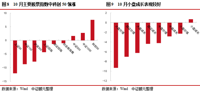 行业表现上,申万一级行业跌多涨少,但上涨的行业增多,计算机、军工、机械设备等行业表现较好。10月,31个申万一级行业有9个上涨、22个下跌,其中计算机、国防军工、机械设备领涨,涨幅分别为16.04%、11.63%、5.74%;食品饮料、房地产、家用电器领跌,跌幅分别为22.14%、14.72%和12.87%。