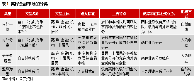经过几十年的发展,离岸金融已发展形成多重内容和类型,其内涵在丰富、外延在扩展。目前,离岸金融市场主要有四种类型,内外一体型、内外分离型、分离渗透型和避税港型。其中,香港是内外一体型。离岸金融的体系,并非一蹴而就、一成不变,会根据国内外经济环境而进行调整。