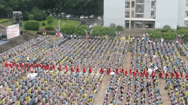因疫情防控需要,典礼现场座位间隔1.2米形成16个方阵,布满整个开阔的会场,20面毕业典礼道旗迎风飘扬。在会场南段依依北望,“勤读力耕 立己达人”八字校训和学校校徽端放在主席台上方。
