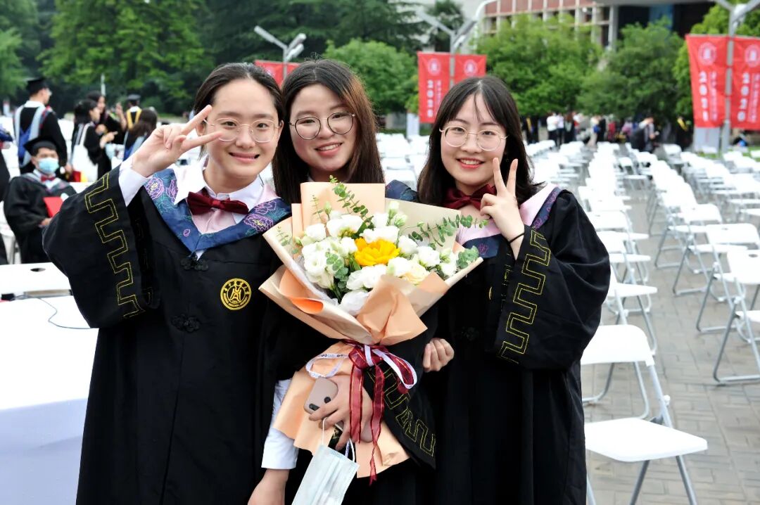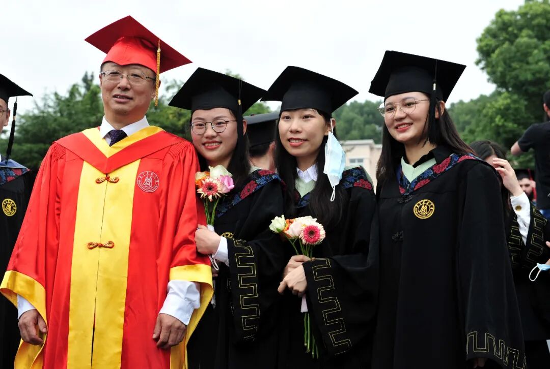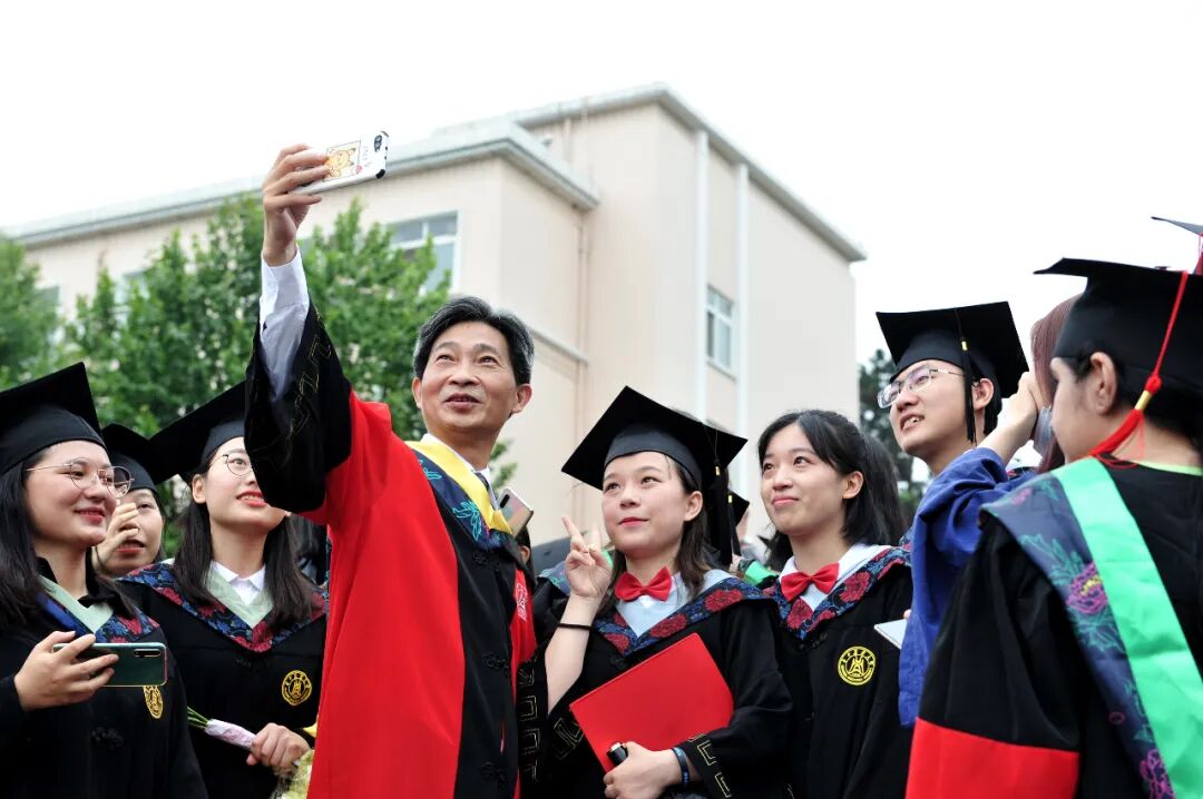 毕业典礼后,毕业生们找到自己的导师、班主任、辅导员、同学等合影留念。狮山一为别,青春不散场。