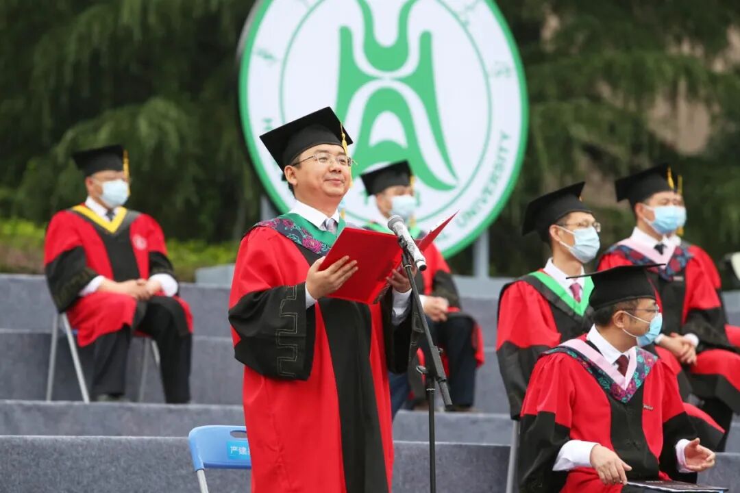 历经风雨洗礼,上午8时整,典礼开始。副校长、校学位评定委员会副主席、作物学教授严建兵博士主持典礼。典礼暨仪式采取线上线下相结合的方式举行,全球师生校友通过直播观看典礼实况。