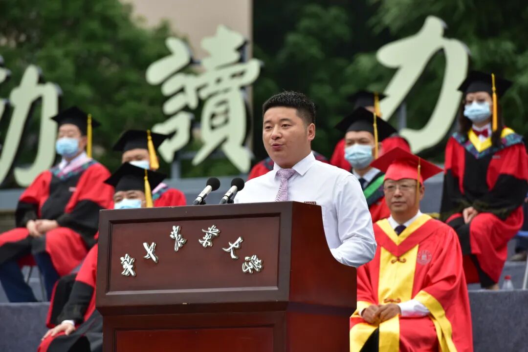 教师代表、曹胜波教授发言。他希望同学们珍惜每一次的人生经历,勇于捕捉智慧积淀的幸福;养成认真做事的习惯,捕捉机遇敲门的幸福;始终葆有科学精神,勇于捕捉心灵安憩的幸福。
